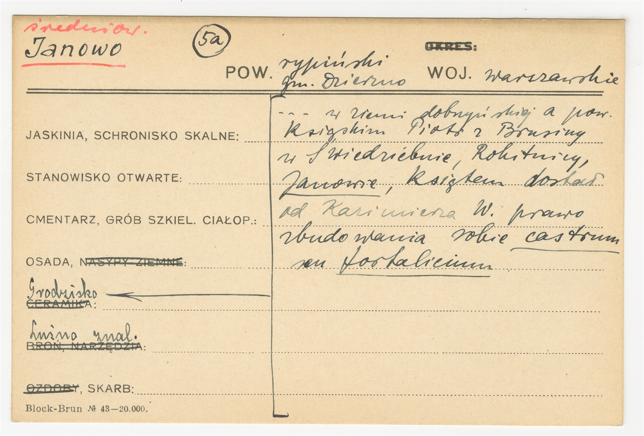 Karta stanowiska "Janowo gm. Dzierzno pow. Rypiński woj. warszawskie" (druk rękopis) - strona 1