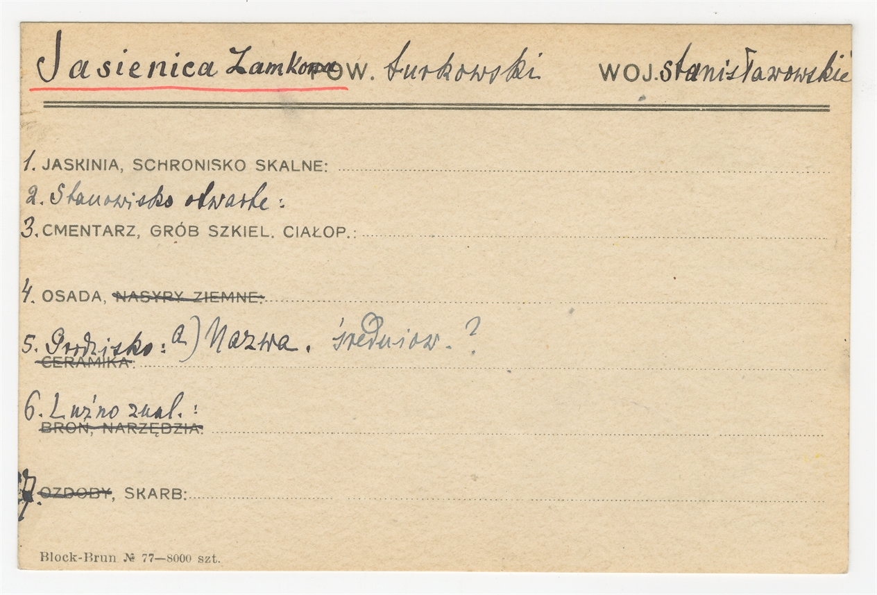 Karta stanowiska "Jasienica Zamkowa pow. turkowski woj. stanisławowskie" (druk rękopis) - strona 1