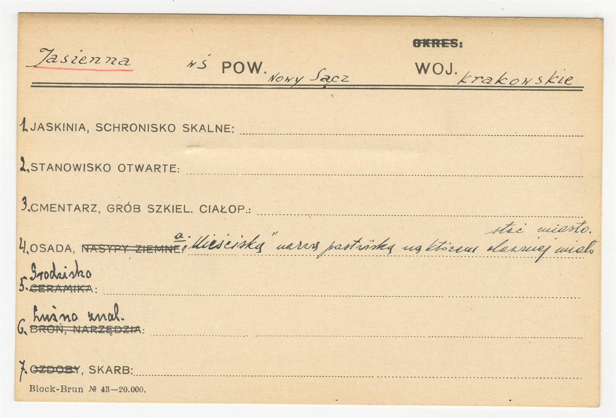 Karta stanowiska "Jasienna  pow. Nowy Sącz  woj. krakowskie" (druk  rękopis) - strona 1