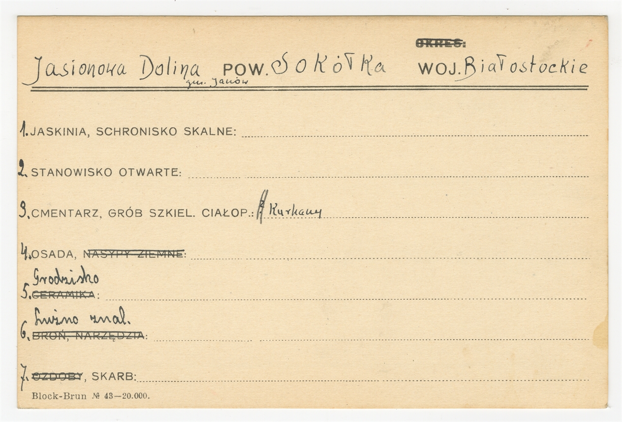 Karta stanowiska "Jasionowa Dolna gm. Janów pow. Sokółka woj. Białostockie" (druk rękopis) - strona 1