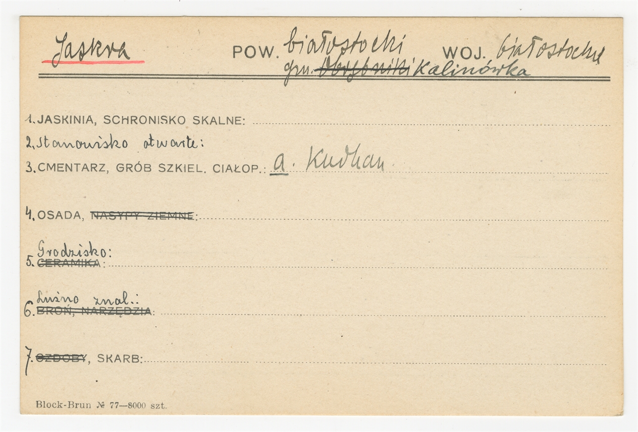 Karta stanowiska "Jaskra  gm. Kalinówka  pow. białostocki  woj. białostockie" (druk  rękopis) - strona 1