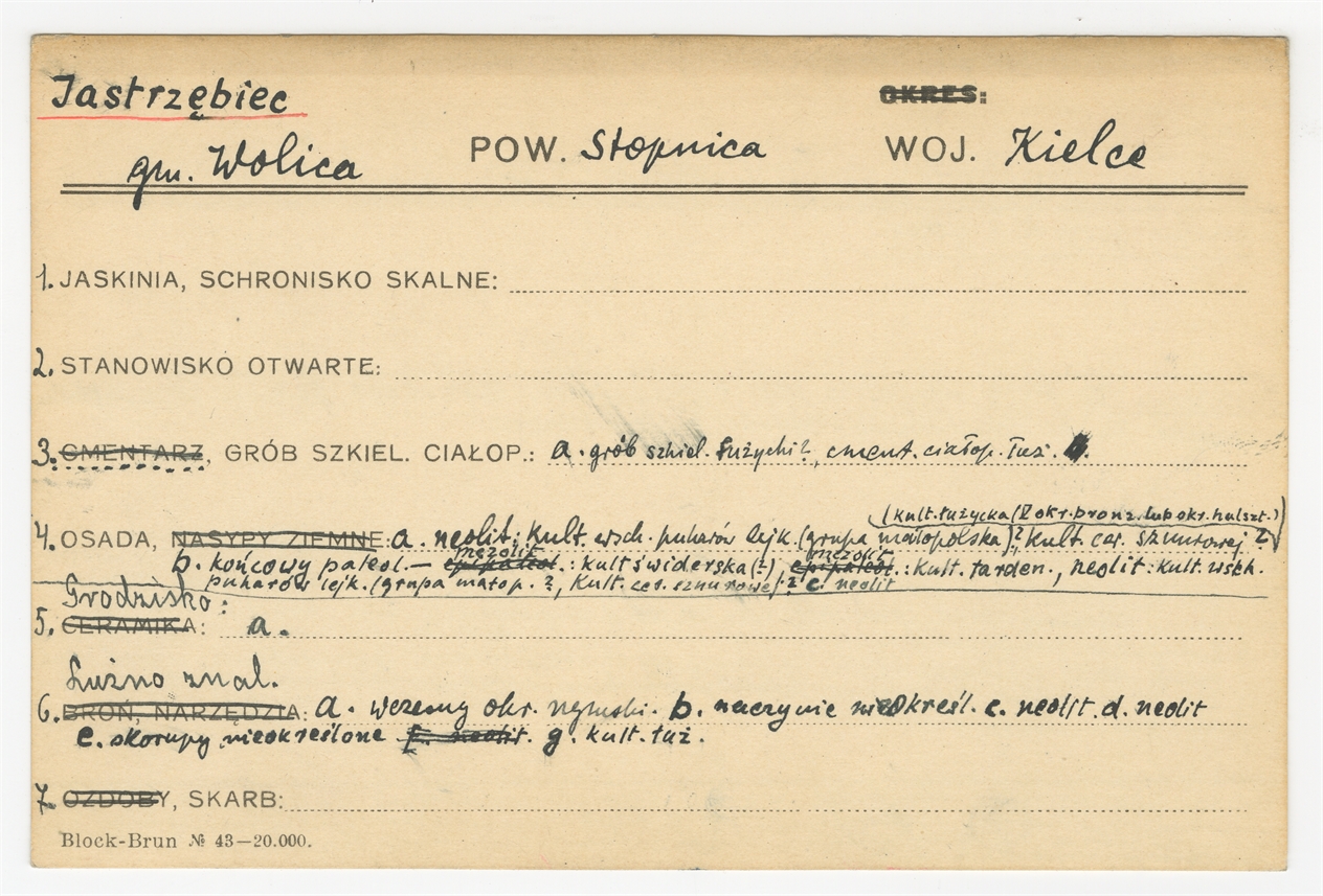 Karta stanowiska "Jastrzębiec gm. Wolica pow. Stopnica woj. Kielce" (druk rękopis) - strona 1