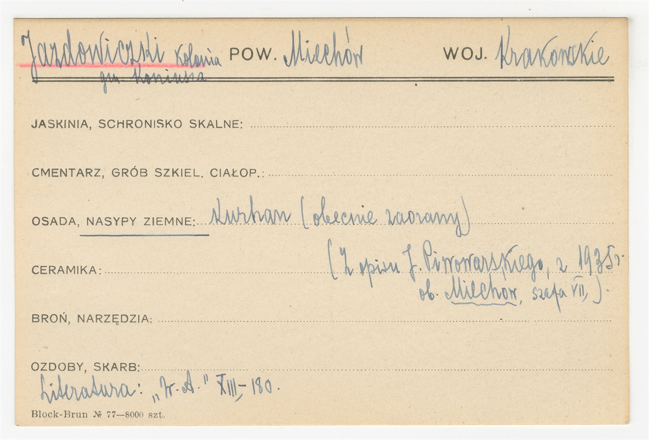Karta stanowiska "Jazdowiczki Kolonia gm. Koniusza pow Miechów woj. Krakowskie" (druk rękopis) - strona 1