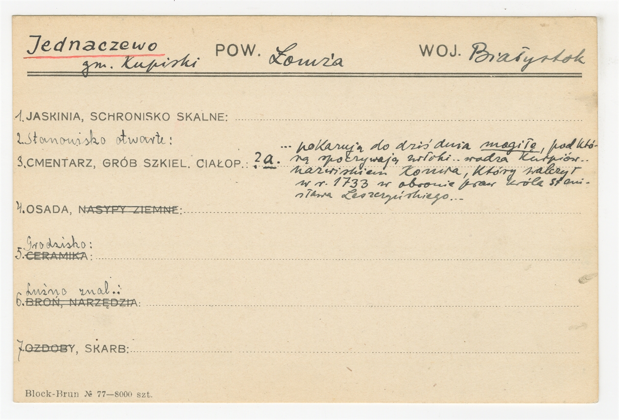 Karta stanowiska "Jednaczewo gm. Kupiski pow Łomża woj. Białystok" (druk rękopis) - strona 1