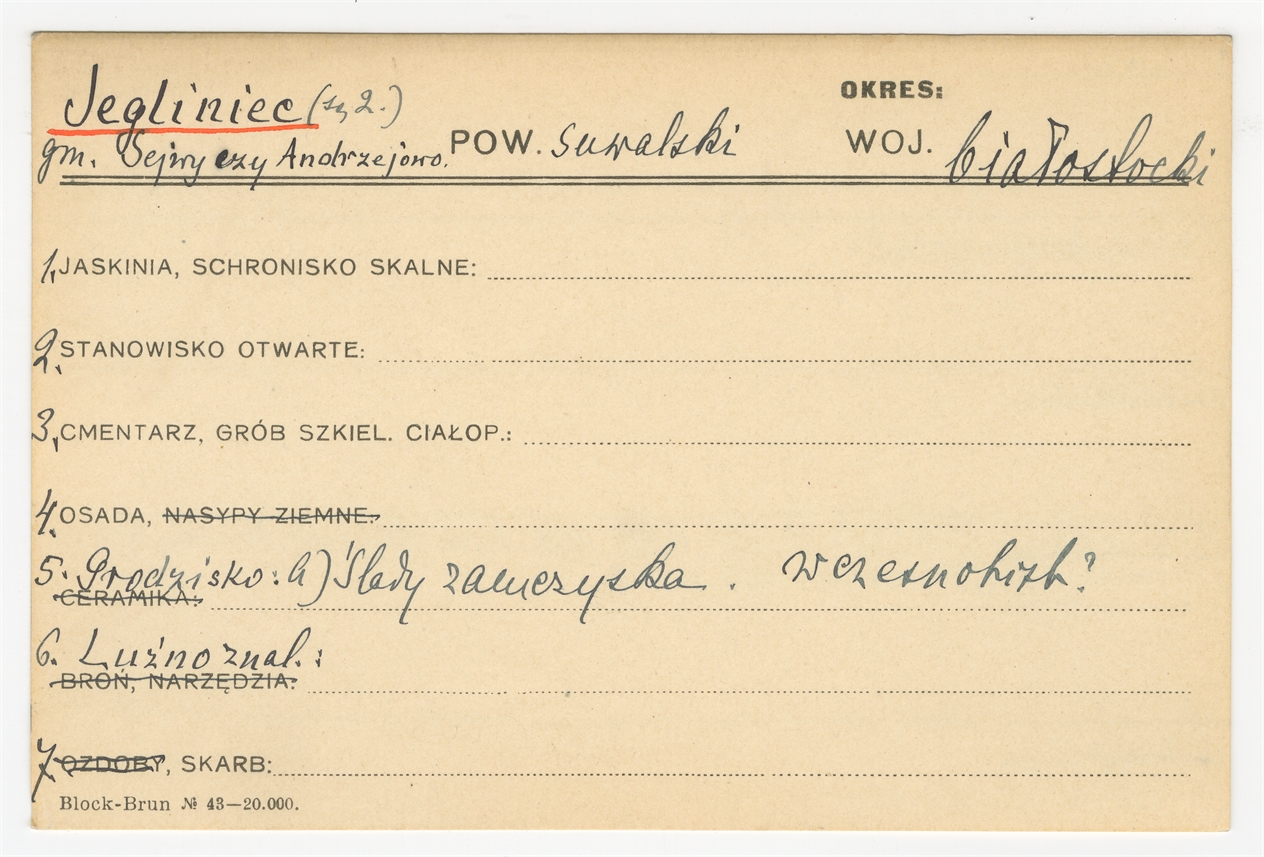 Karta stanowiska "Jegliniec gm. Sejwy czy Andrzejewo pow. Suwalski woj. biaostockie" (druk rękopis) - strona 1
