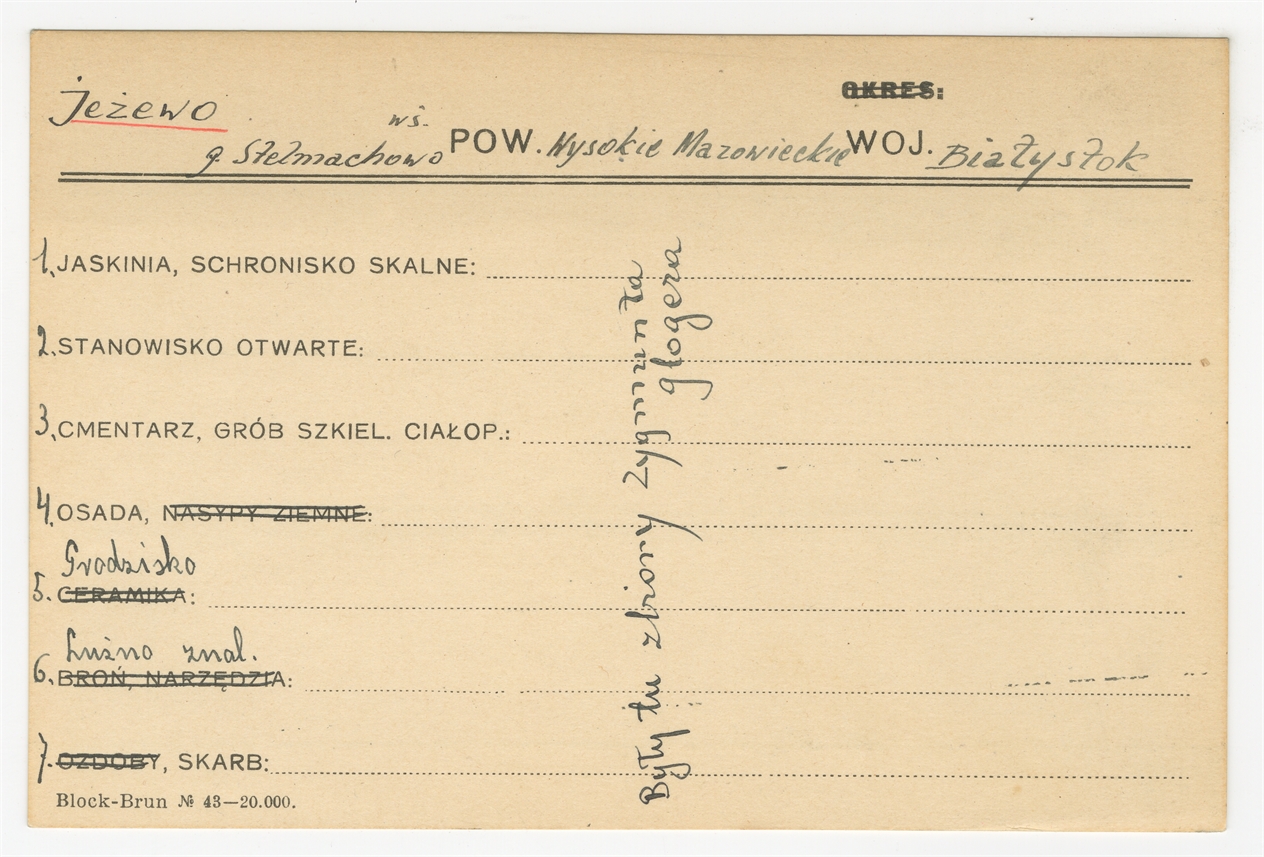 Karta stanowiska "Jeżewo g. Stelmachowo pow. Wysokie Mazowieckie woj. Białystok" (druk rękopis) - strona 1