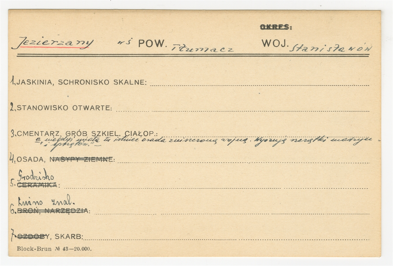 Karta stanowiska "Jezierzany pow. Tłumacz woj. Stanisławów" (druk rękopis) - strona 1