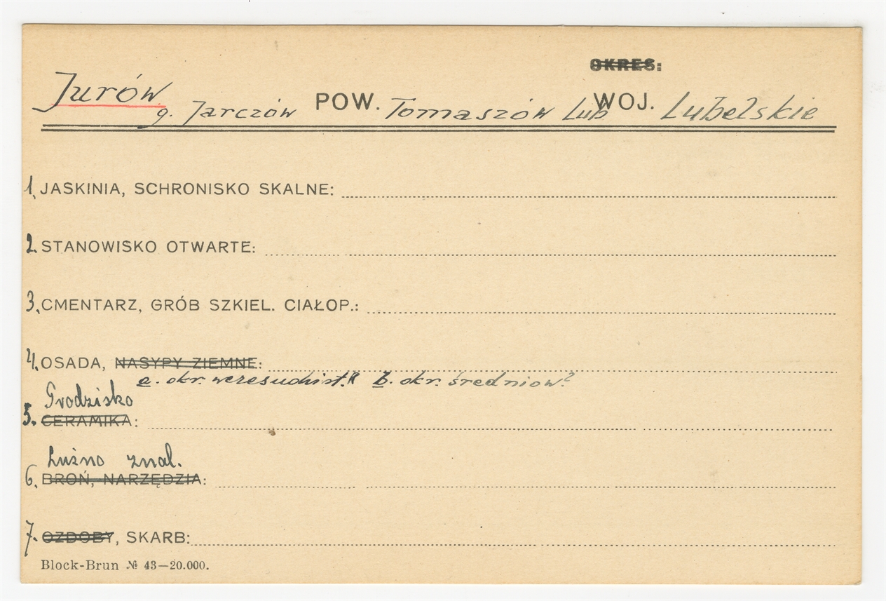 Karta stanowiska "Jurów g. Jaraczów pow. Tomaszów Lub. woj. Lubelskie" (druk rękopis) - strona 1