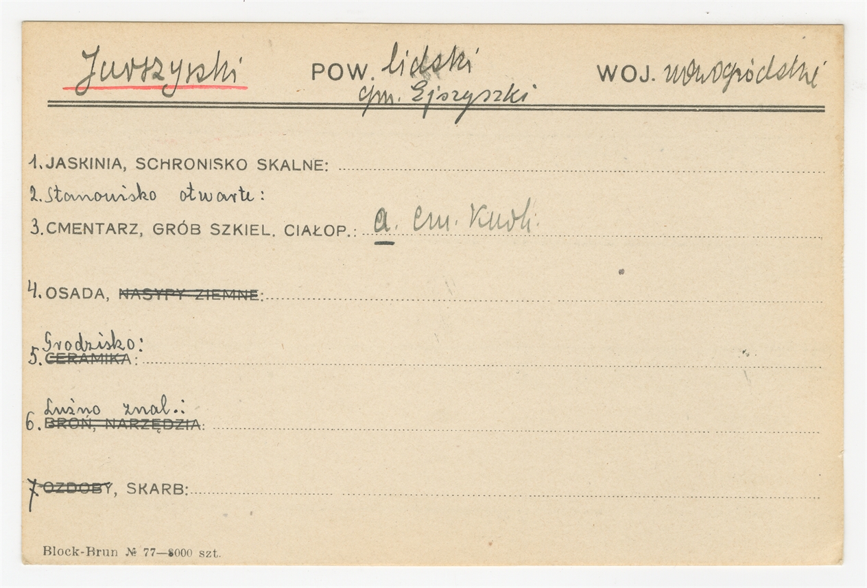 Karta stanowiska "Jurszyszki gm. Ejszyszki pow. lidzki woj. nowogródzkie" (druk rękopis) - strona 1