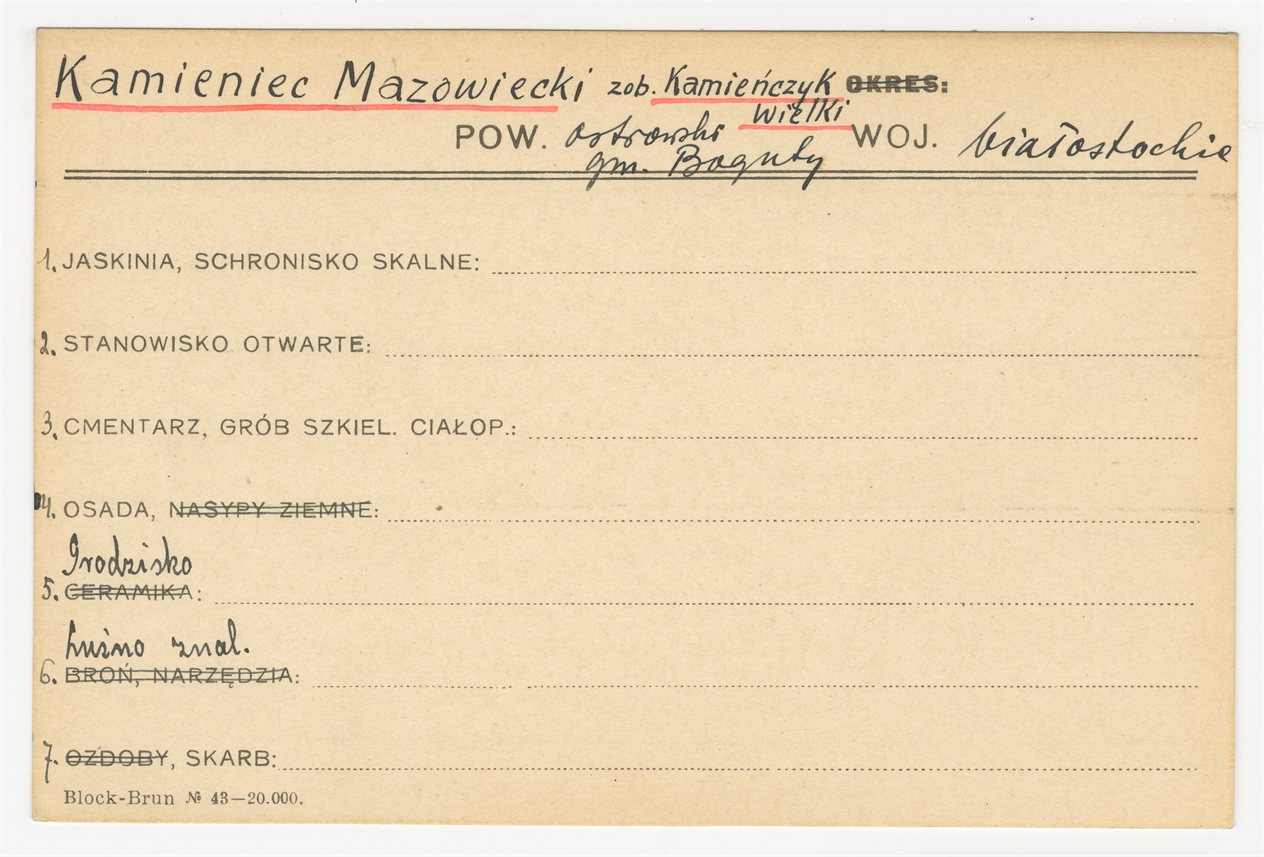 Karta stanowiska "Kamieniec Mazowiecki zob. Kamieńczyk Wielki gm. Boguty pow. ostrowski woj. białostockie" (druk rękopis) - strona 1