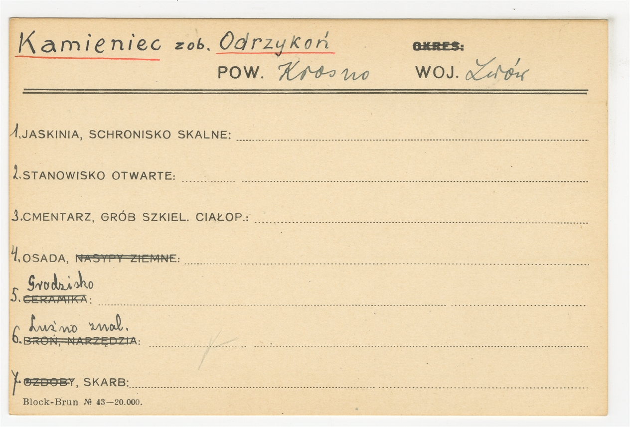 Karta stanowiska "Kamieniec zob. Odrzykoń pow. Krosno woj. Lwów" (druk rękopis) - strona 1