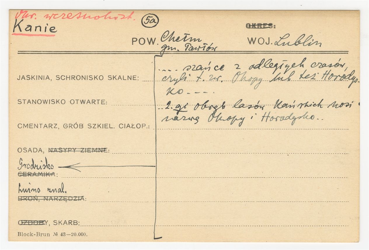 Karta stanowiska "Kanie gm. Pawłów pow. Chełm woj. Lublin" (druk rękopis) - strona 1