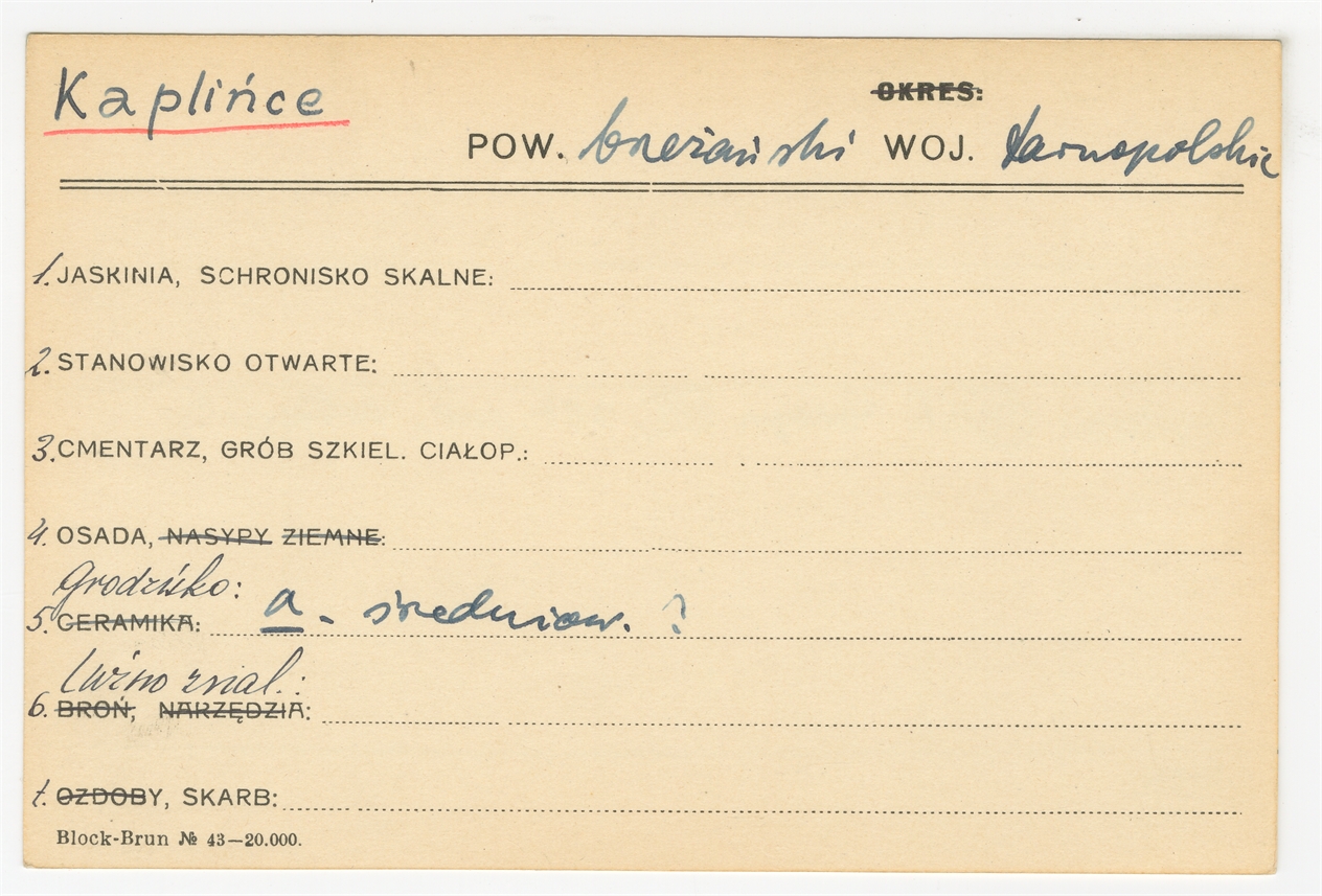 Karta stanowiska "Kaplińce pow. brzeżański woj. tarnopolskie" (druk rękopis) - strona 1