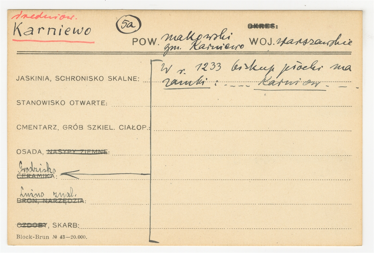 Karta stanowiska "Karniewo gm. Karniewo pow. makowski woj. warszawskie" (druk rękopis) - strona 1