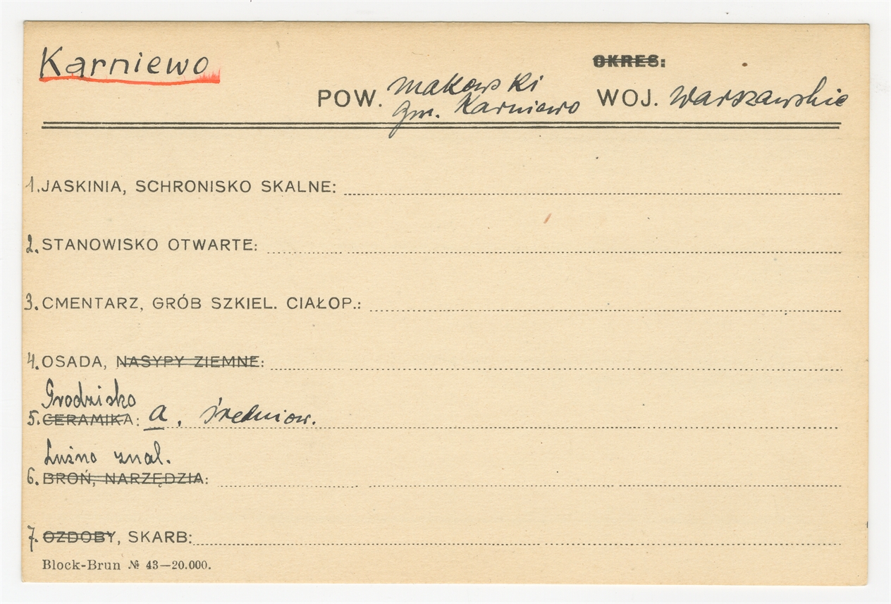 Karta stanowiska "Karniewo gm. Karniewo pow. makowski woj. warszawskie" (druk rękopis) - strona 1
