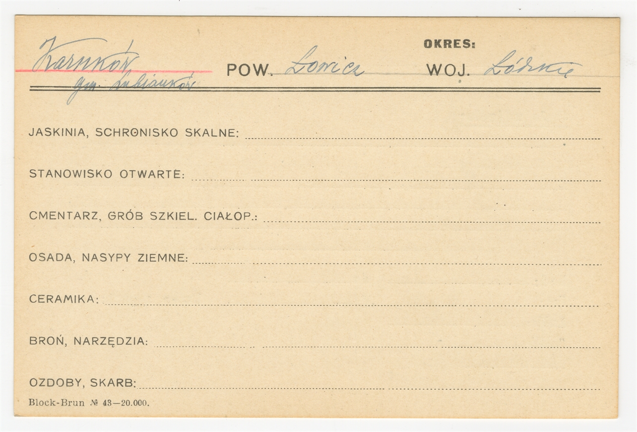 Karta stanowiska "Karnków gm. Lubianków pow. Łowicz woj. Łódzkie" (druk rękopis) - strona 1