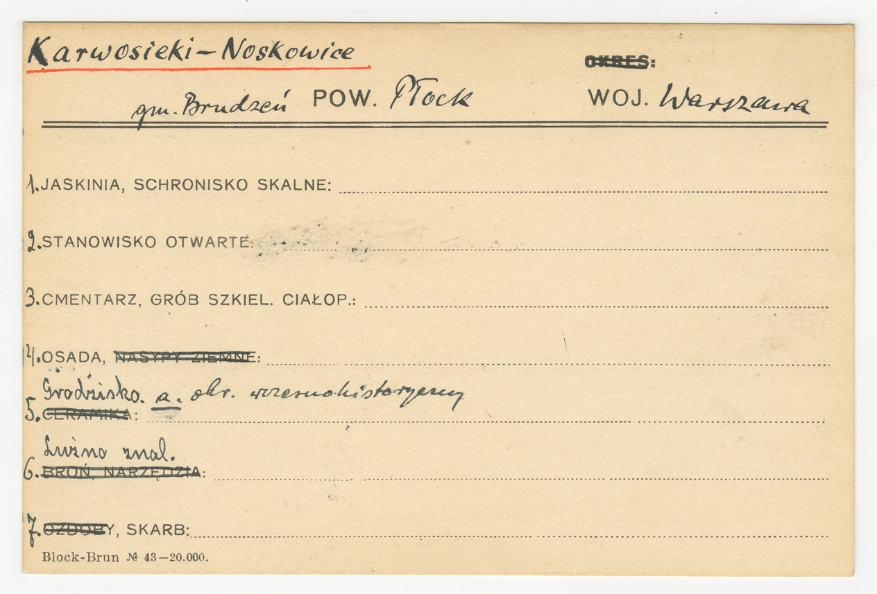 Element 1 - Karta stanowiska "Karwosieki-Noskowice gm. Brudzeń pow. Płock woj. Warszawa" (druk rękopis) - strona 1