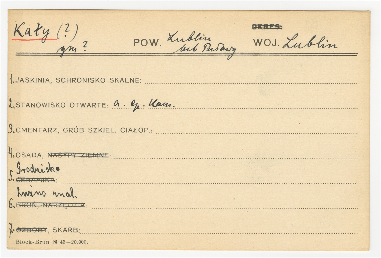 Karta stanowiska "Kąty (?) gm. ? pow. Lublin lub Puławy woj. Lublin" (druk rękopis) - strona 1
