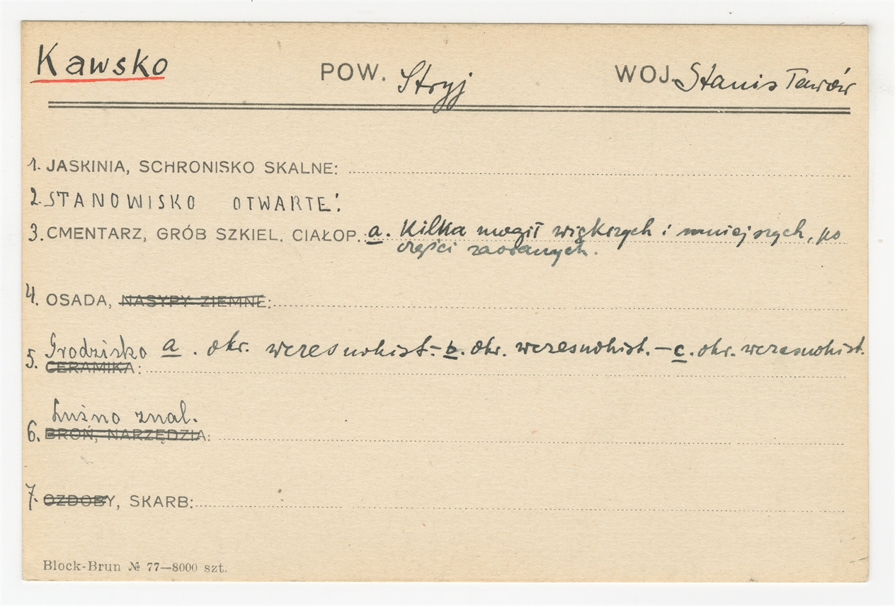 Karta stanowiska "Kawsko pow. Stryj woj. Stanisławów" (druk rękopis) - strona 1