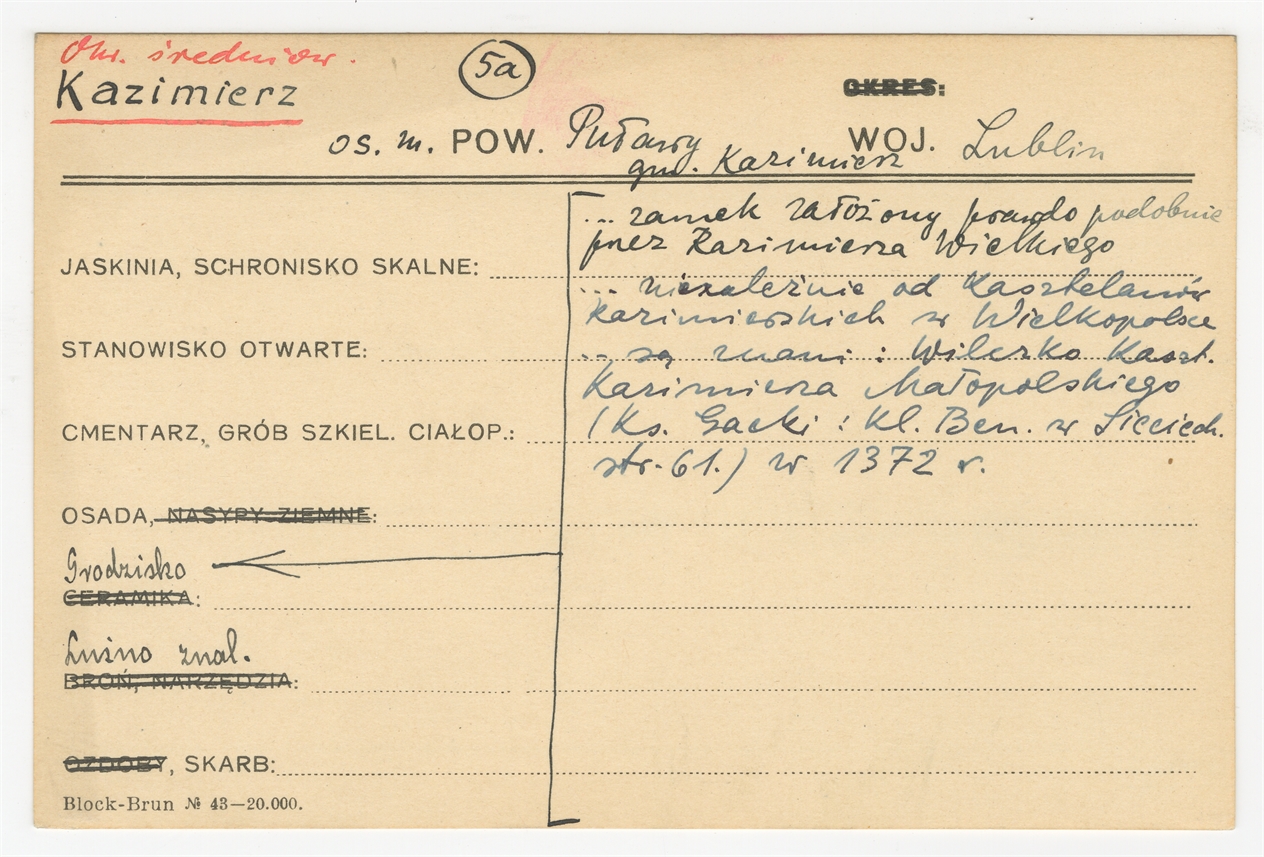 Karta stanowiska "Kazimierz gm. Kazimierz pow. Puławy woj. Lublin" (druk rękopis) - strona 1