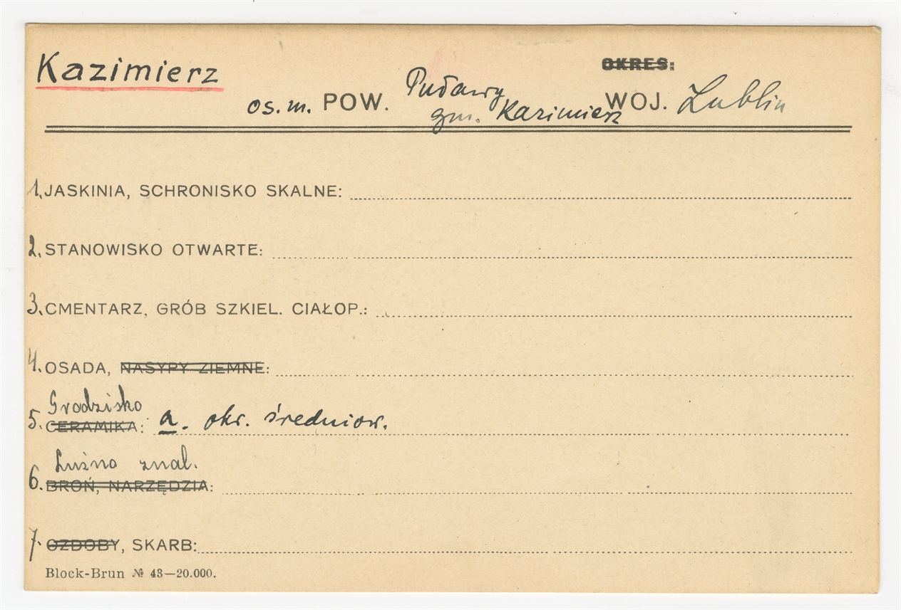 Karta stanowiska "Kazimierz gm. Kazimierz pow. Puławy woj. Lublin" (druk rękopis) - strona 1