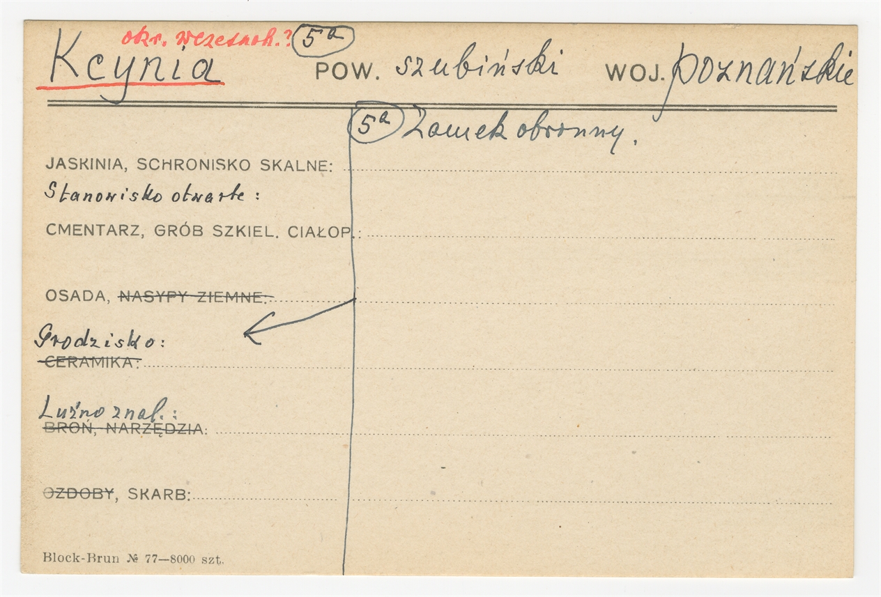 Karta stanowiska "Kcynia pow. szubiński woj. poznańskie" (druk rękopis) - strona 1
