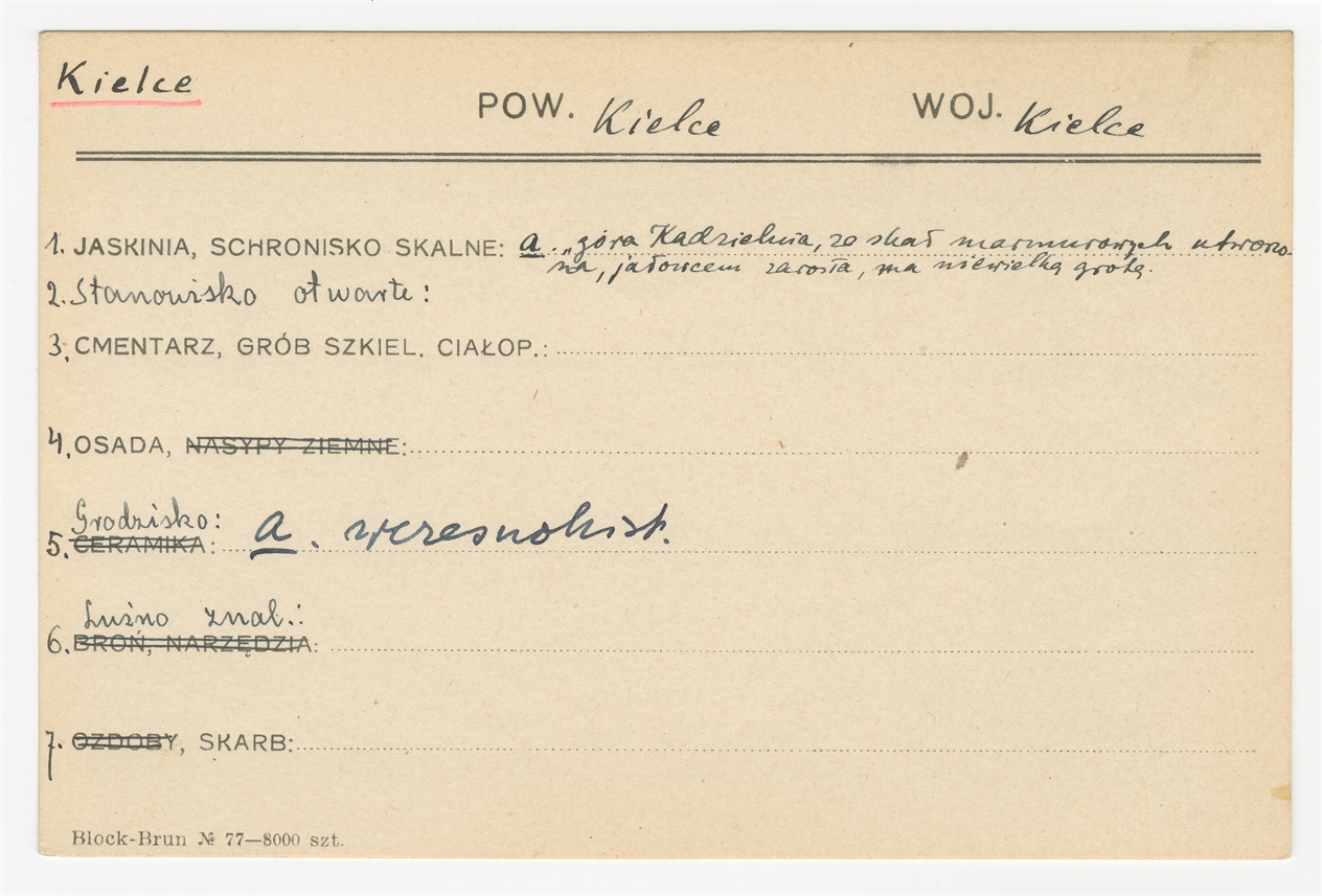 Karta stanowiska "Kielce pow. Kielce woj. Kielce" (druk rękopis) - strona 1
