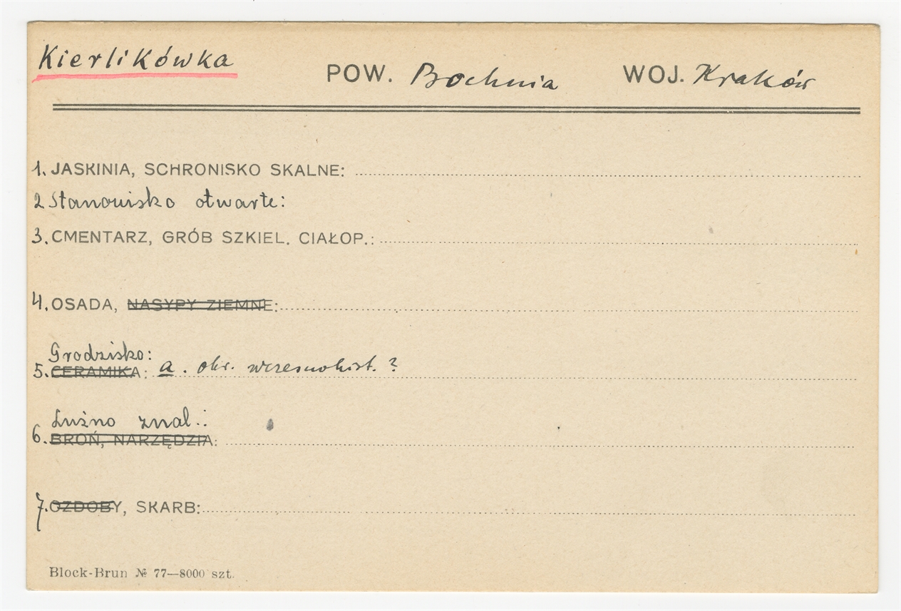 Karta stanowiska "Kierlikówka pow. Bochnia woj. Kraków" (druk rękopis) - strona 1