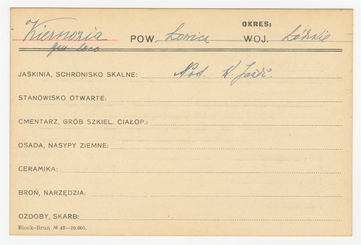 Karta stanowiska "Kiernozia gm. loco pow. Łowicz woj. Łódzkie" (druk rękopis) - strona 1