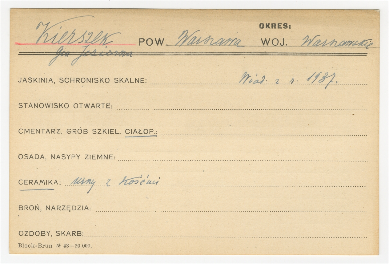 Karta stanowiska "Kierszek gm. Jeziorna pow. Warszawa woj. Warszawskie" (druk rękopis) - strona 1