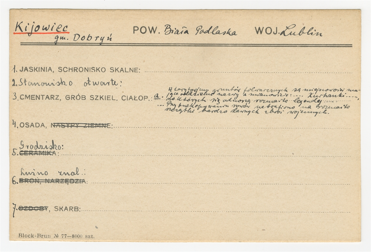 Karta stanowiska "Kijowiec gm. Dobryń pow. Biała Podlaska woj. Lublin" (druk rękopis) - strona 1