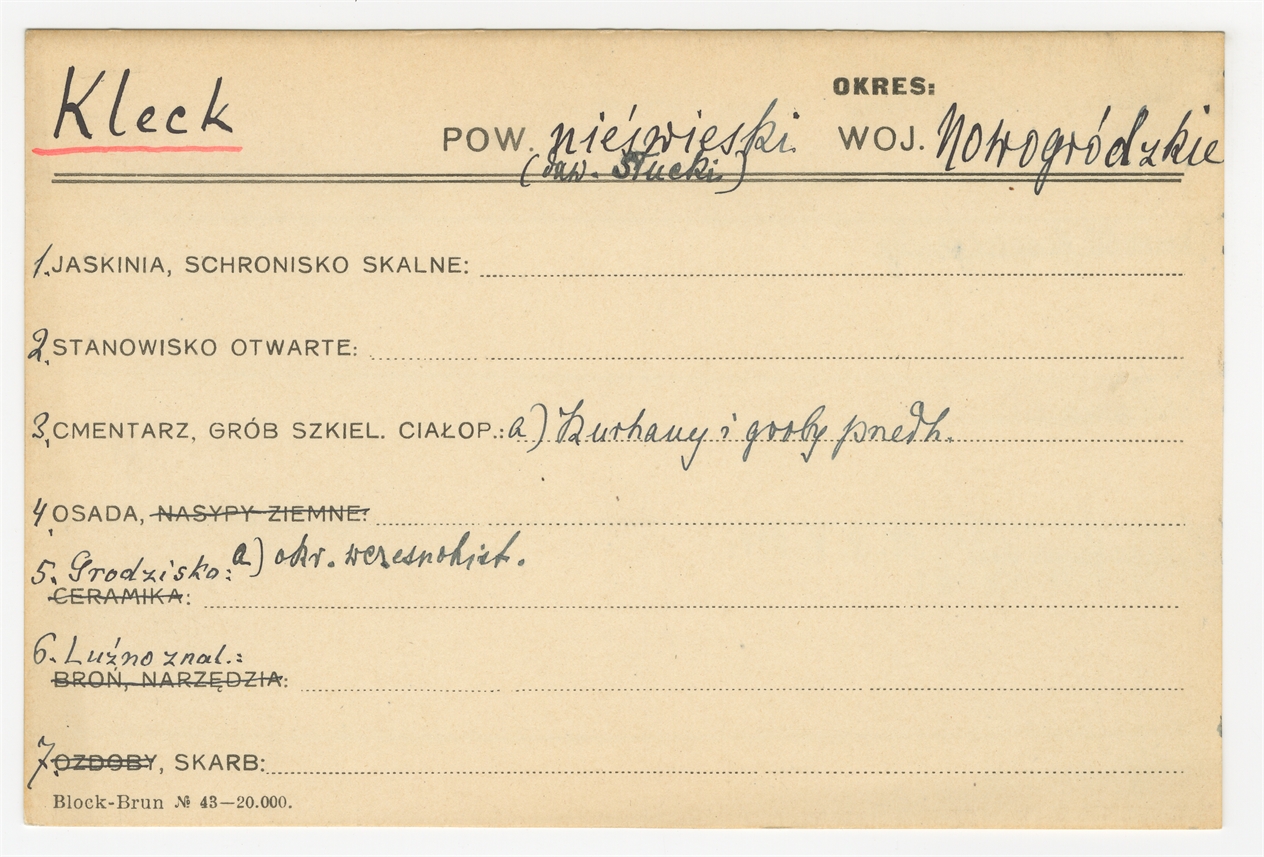Element 1 - Karta stanowiska "Kleck pow. nieświeski (daw. Słucki) woj. Nowogródzkie" (druk rękopis) - strona 1