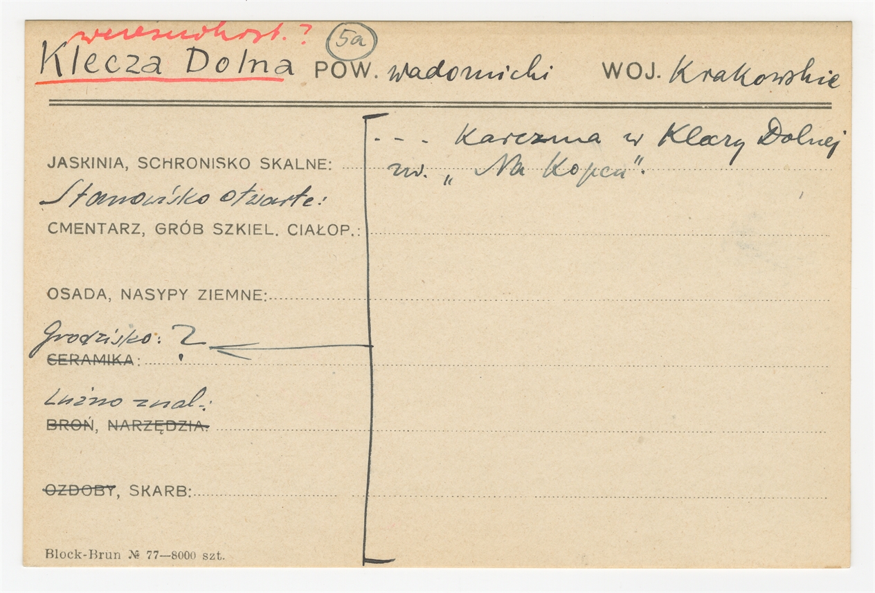 Karta stanowiska "Klecza Dolna pow. wadowicki woj. krakowskie" (druk rękopis) - strona 1