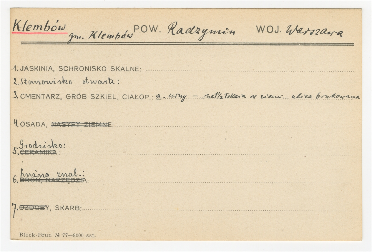 Karta stanowiska "Klembów gm. Klembów pow. Radzymin woj. Warszawa" (druk rękopis) - strona 1