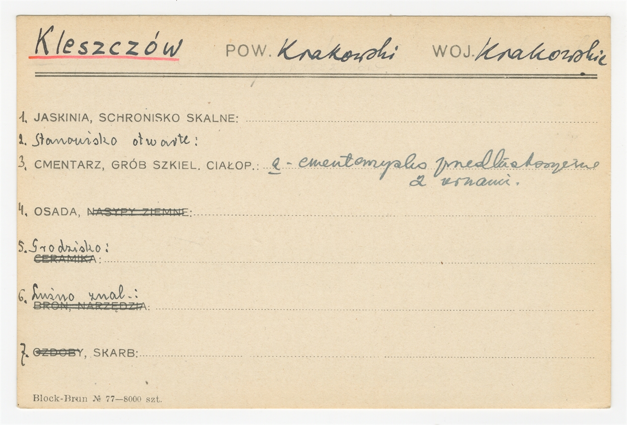 Karta stanowiska "Kleszczów pow. Krakowski woj. Krakiewskie" (druk rękopis) - strona 1