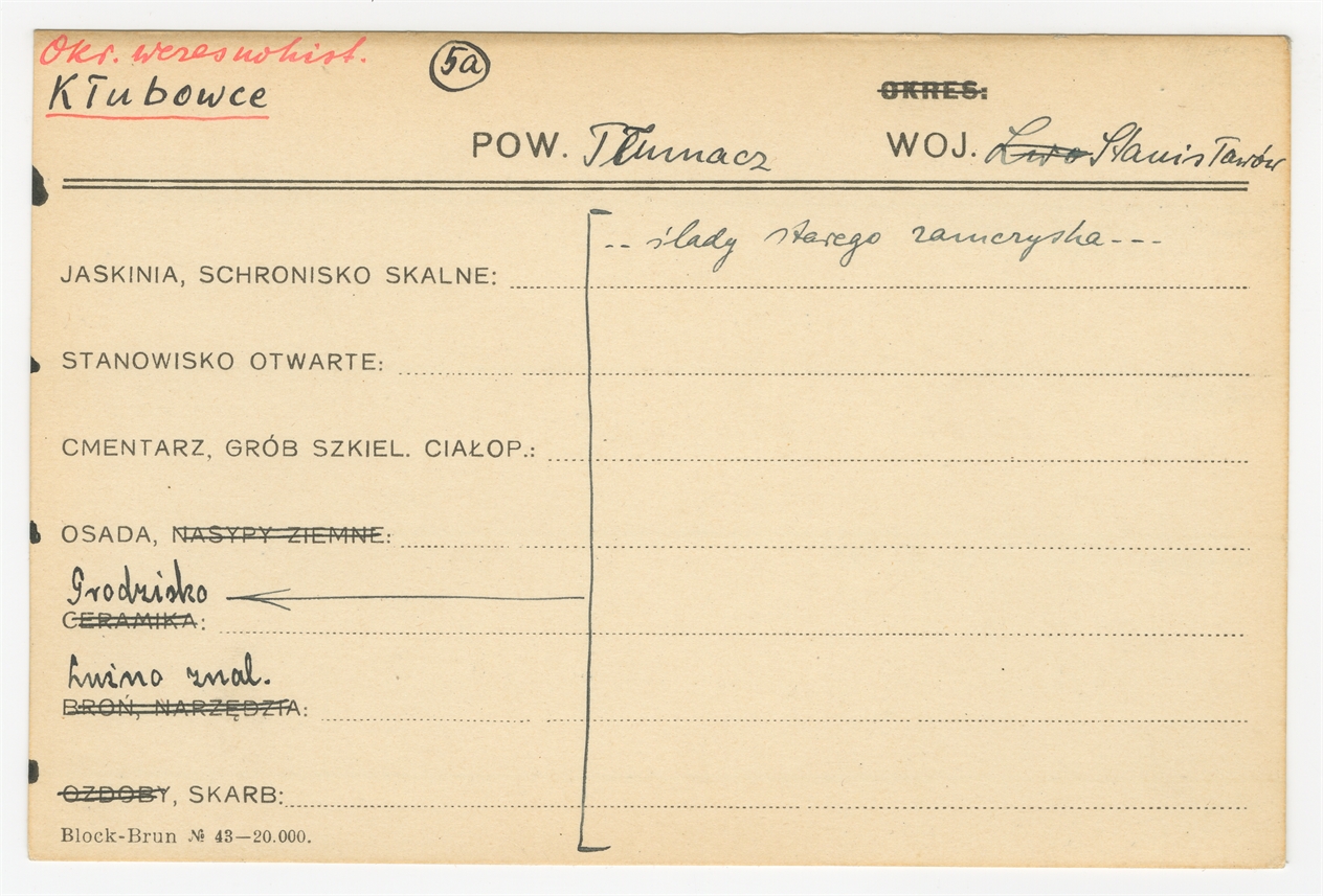 Karta stanowiska "Kłubowce pow. Tłumacz woj. Stanisławów" (druk rękopis) - strona 1