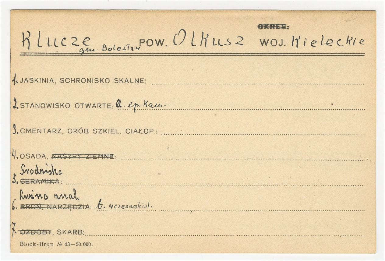 Karta stanowiska "Klucze gm. Bolesław pow. Olkusz woj. Kieleckie" (druk rękopis) - strona 1