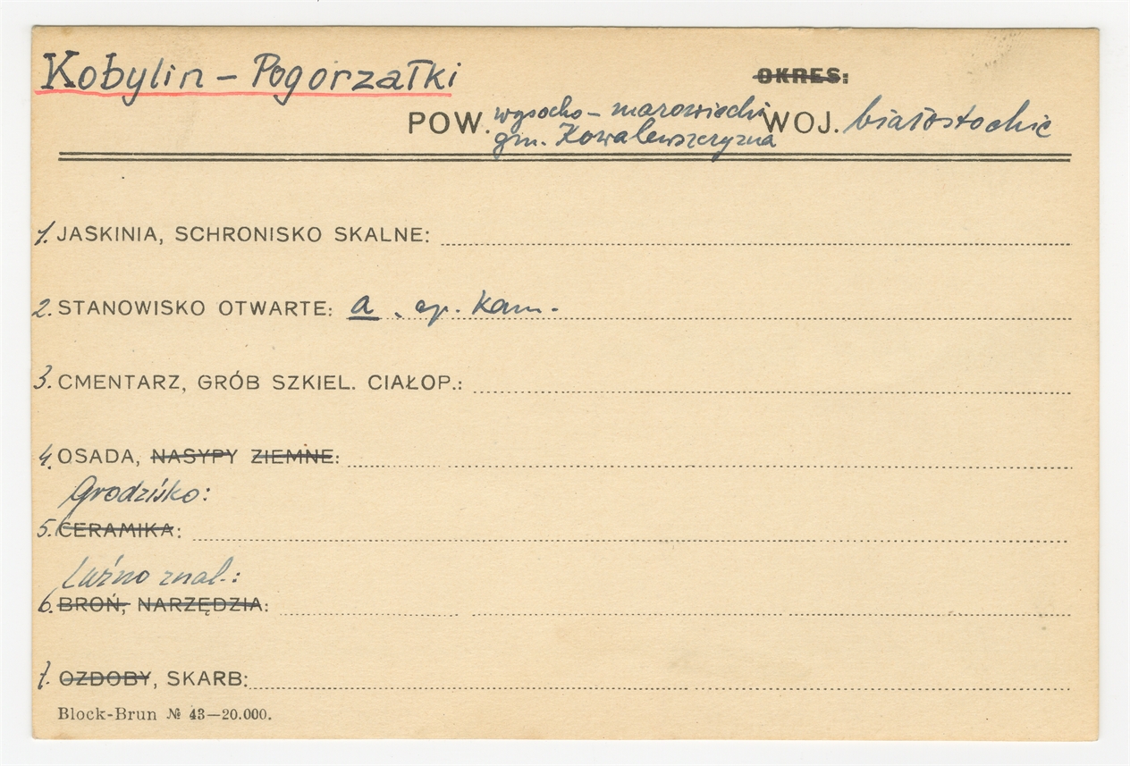 Karta stanowiska "Kobylin-Pogorzałki gm. Kowalewszczyzna pow. wysocko-mazowiecki woj. białostockie" (druk rękopis) - strona 1