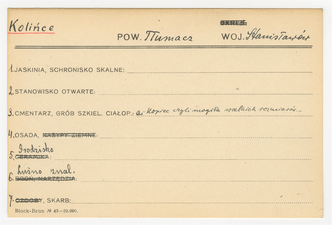 Karta stanowiska "Kolińce pow. Tłumacz woj. Stanisławów" (druk rękopis) - strona 1