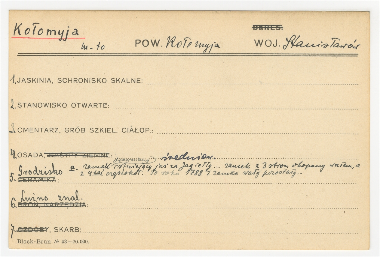 Karta stanowiska "Kołomyja pow. Kołomyja woj. Stanisławów" (druk rękopis) - strona 1