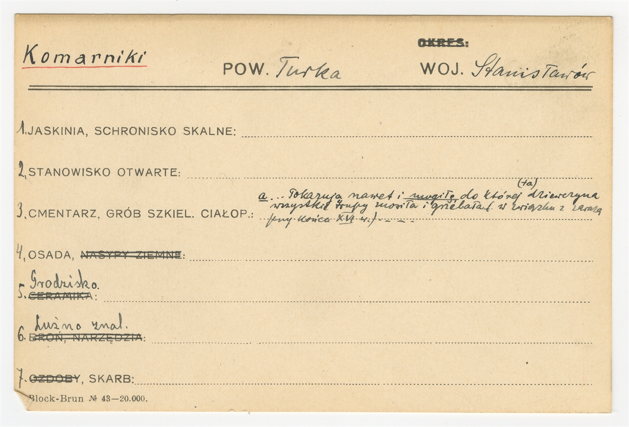 Element 1 - Karta stanowiska "Komarniki pow. Turka woj. Stanisławów" (druk rękopis) - strona 1