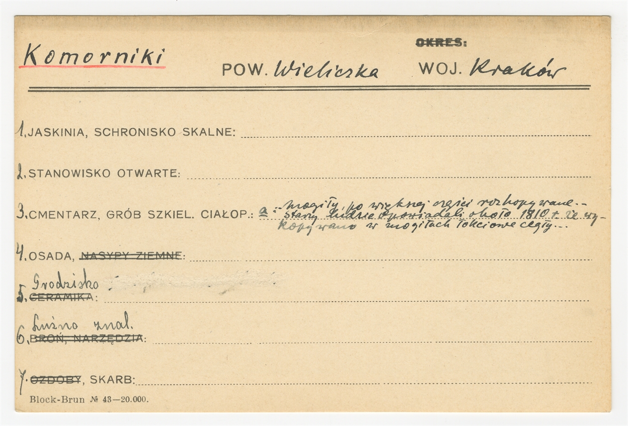 Karta stanowiska "Komorniki pow. Wieliczka woj. Kraków" (druk rękopis) - strona 1