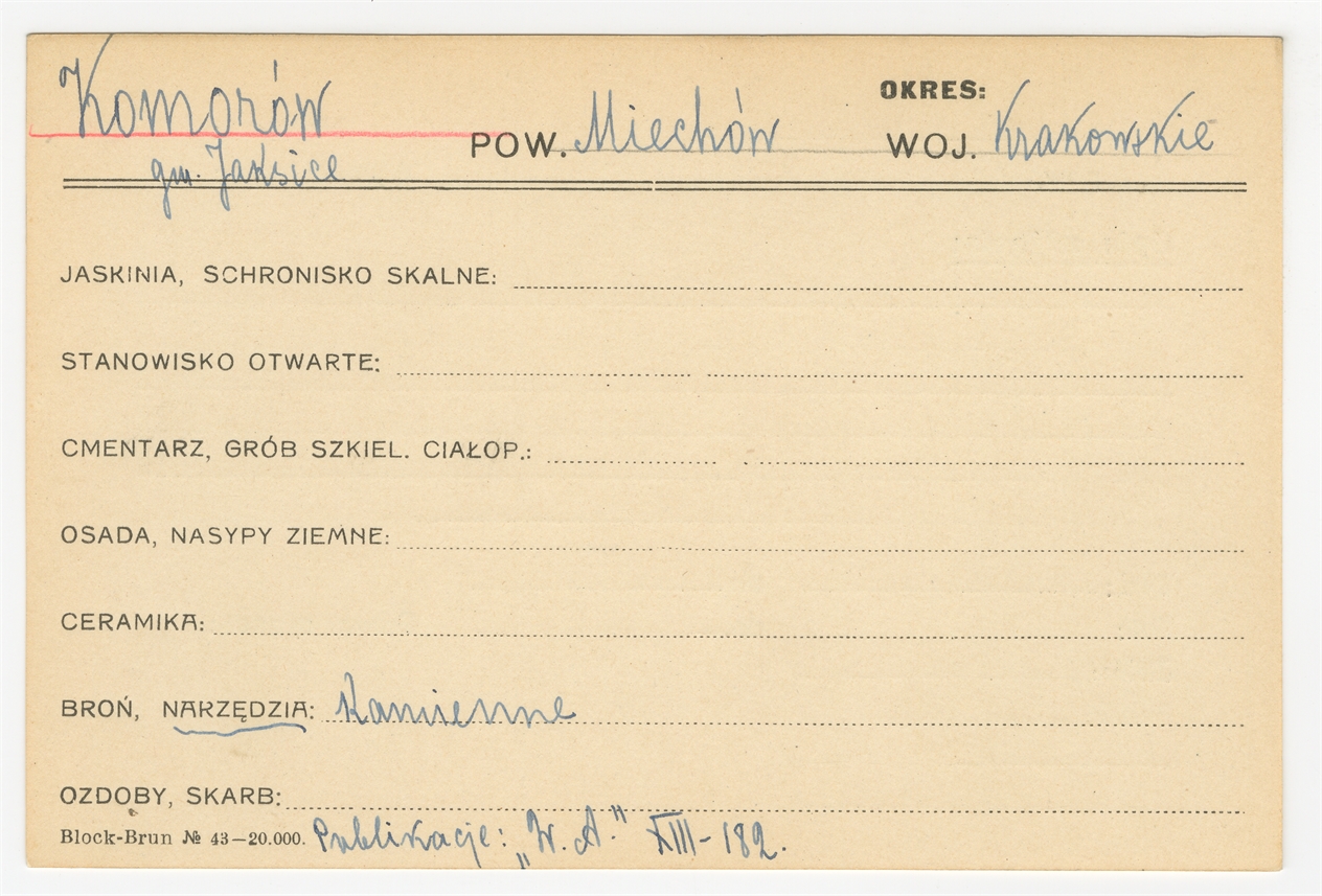 Karta stanowiska "Komorów gm. Jaksice pow. Miechów woj. Krakowskie" (druk rękopis) - strona 1