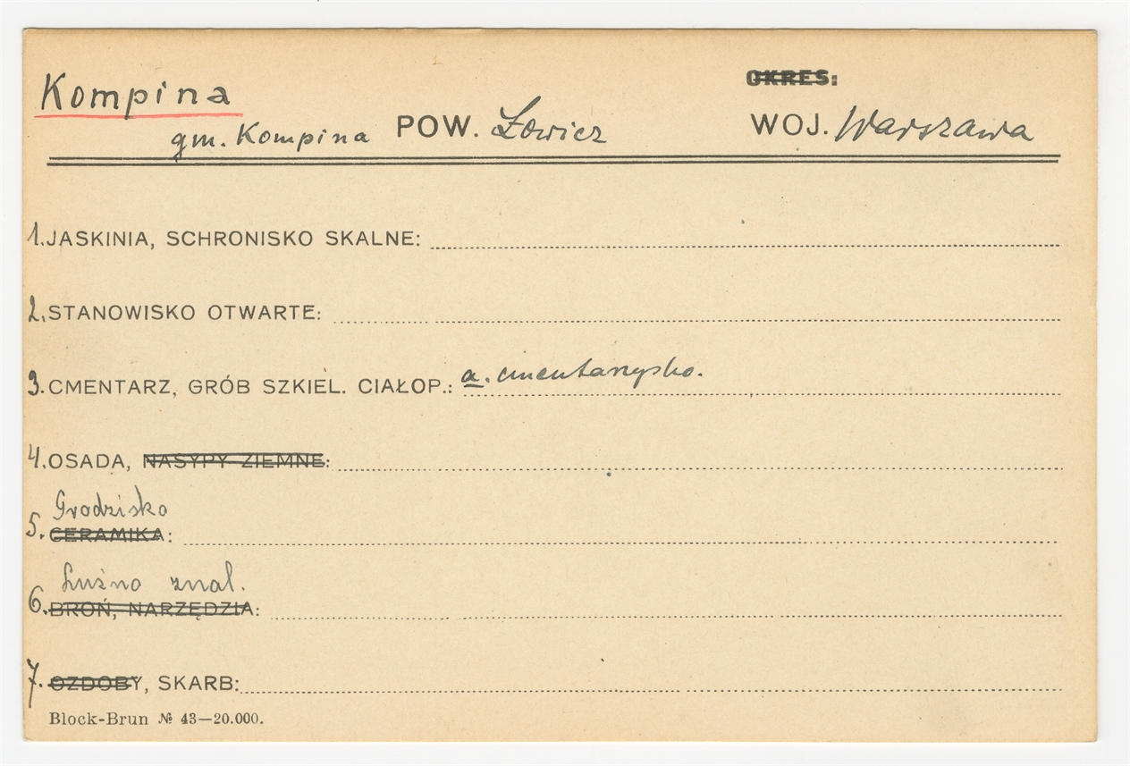 Karta stanowiska "Kompina gm. Kompina pow. Łowicz woj. Warszawa" (druk rękopis) - strona 1