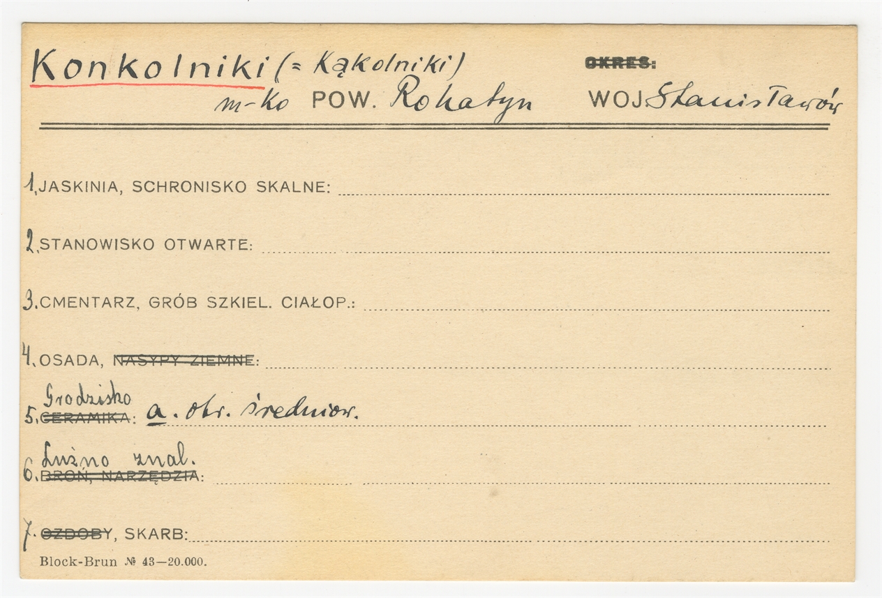 Element 1 - Karta stanowiska "Konkolniki (= Kąkolniki) pow. Rohatyn woj. Stanisławów" (druk rękopis) - strona 1