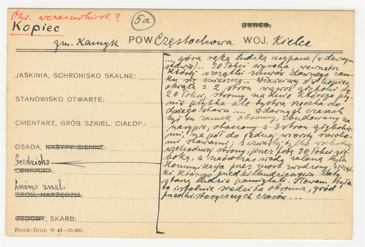 Karta stanowiska "Kopiec gm. Kamyk pow. Częstochowa woj. Kielce" (druk rękopis) - strona 1