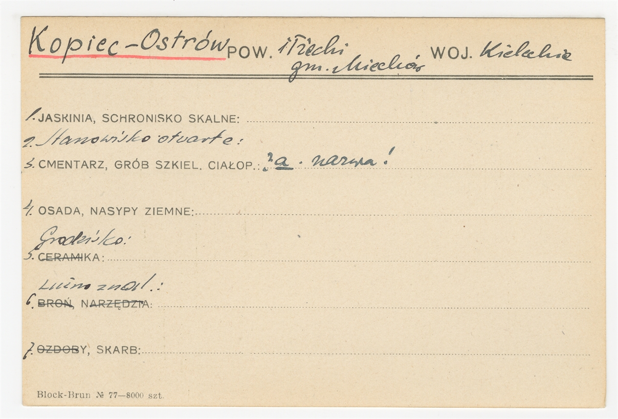 Karta stanowiska "Kopiec-Ostrów gm. Miechów pow. iłżecki woj. Kieleckie" (druk rękopis) - strona 1
