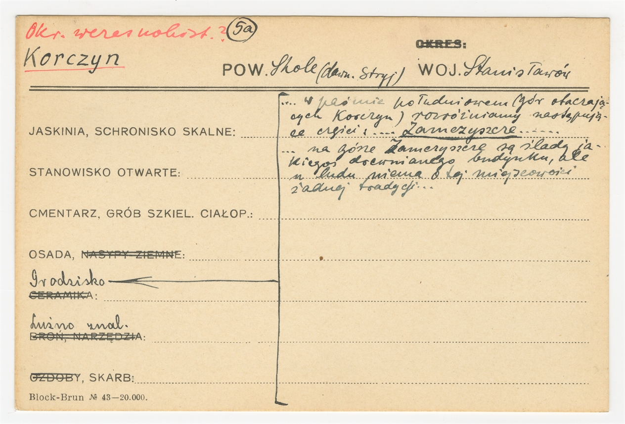 Karta stanowiska "Korczyn pow. Skole (dawn. Stryj) woj. Stanisławów" (druk rękopis) - strona 1
