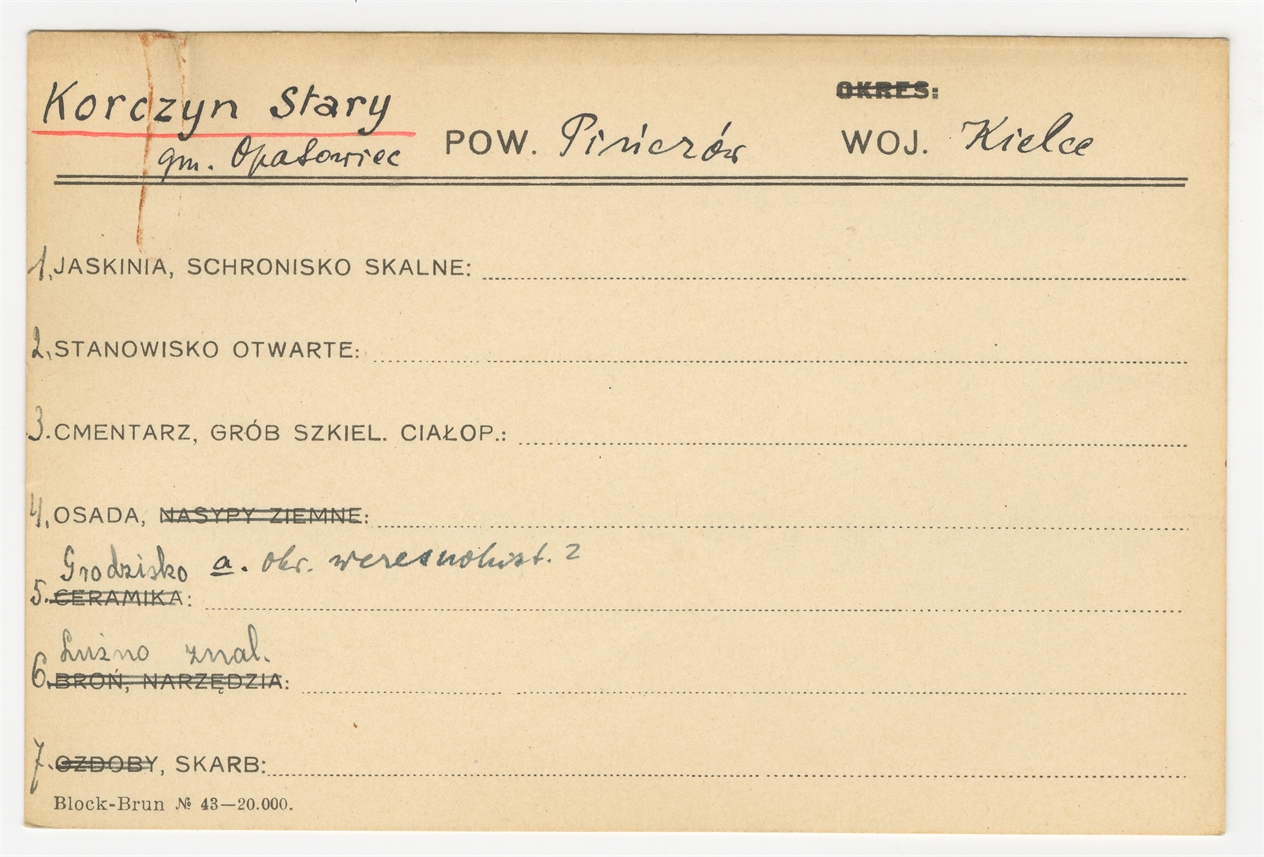 Karta stanowiska "Korczyn Stary gm. Opatowiec pow. Pińczów woj. Kielce" (druk rękopis) - strona 1