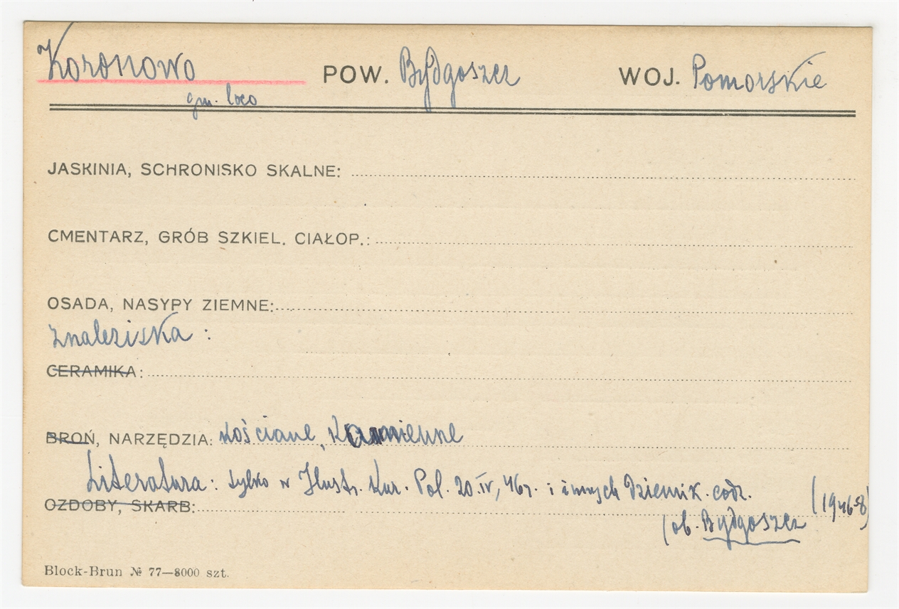 Karta stanowiska "Koronowo gm. Loco pow. Bydgoszcz woj. Pomorskie" (druk rękopis) - strona 1
